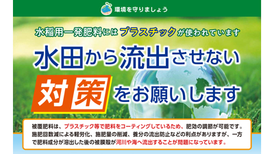 同時に、JAなどは流出の実態じったいをくわしく調査ちょうさし、より効果的こうかてきな流出防止策ぼうしさく継続的けいぞくてき検討けんとうしていきます。代わりとなる技術ぎじゅつを開発したり広めたりすることによる「プラスチックのまくにたよらない農業の実現じつげん」が大切です。肥料ひりょうをおおうまくをうすくしてプラスチック使用量をらした肥料ひりょうを広めたり、海に流出しても分解ぶんかいする生分解性せいぶんかいせいプラスチックなどの素材を使用した肥料ひりょうを開発したりすることにも取り組みます。