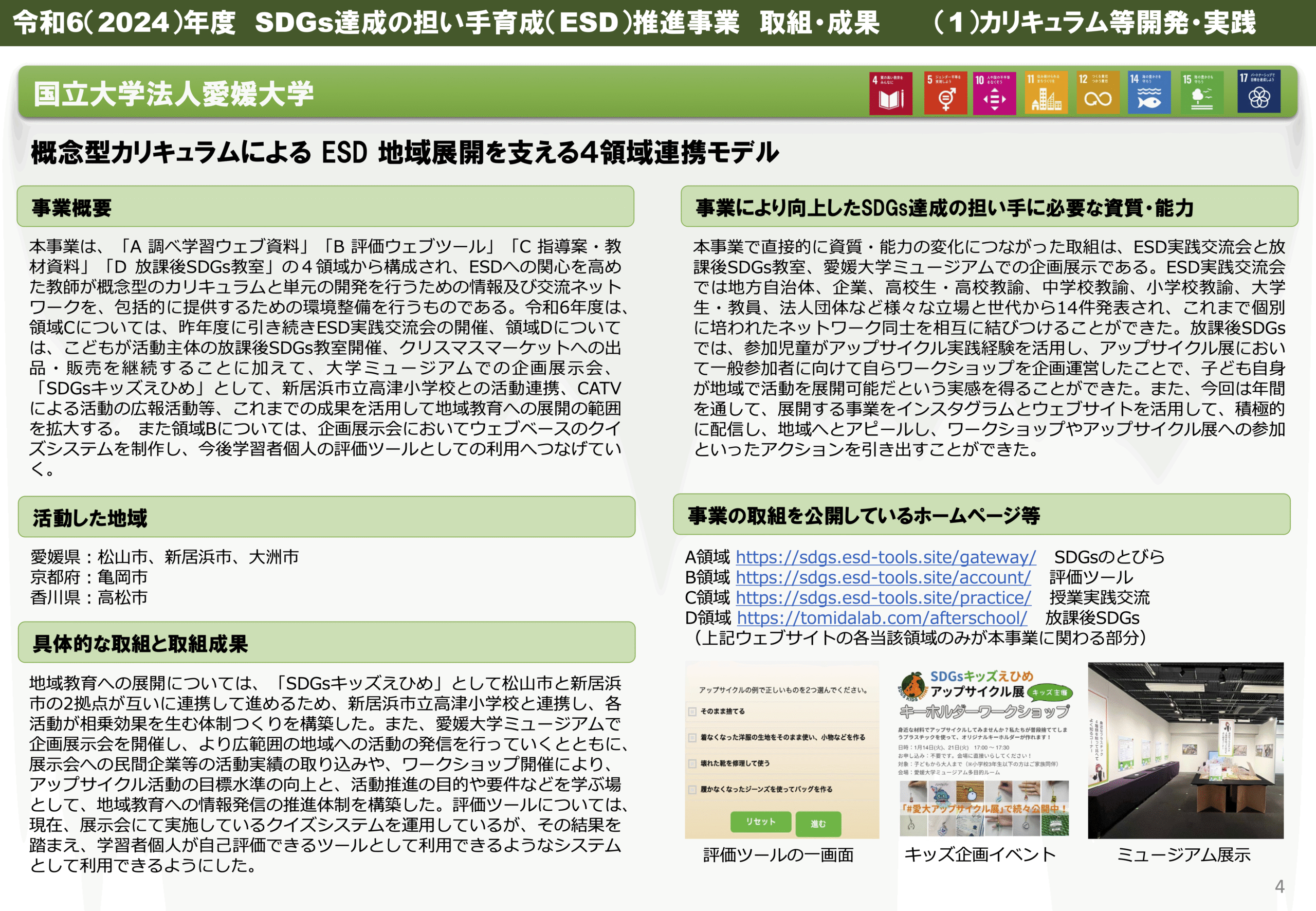 令和6年度は、愛媛大学、愛媛大学ミュージアム、そしてユネスコスクールが連携し、松山市、新居浜市、大洲市、京都市、香川県高松市といった複数の地域で、ESD活動の拠点づくりと地域活動の推進を行いました 。特に、放課後SDGs教室「SDGsキッズひめ」の活動が充実し、学生による模擬授業やクリスマスマーケットへの出店、地元企業との連携など、様々な実践を展開しています 。また、事業の展開としては、ウェブベースのダイナモジュールを企業展示会において活用し、学習習得個人の評価ツールとともに、地域の教育現場への普及啓発と推進体制の強化に利用されています 。これらの活動を通じて、参加者はESD交流会やワークショップでアップサイクル実践や課題解決を行い、「自ら課題を見つけて解決を図る」といったSDGs達成に必要な資質・能力を引き出すことができています 。