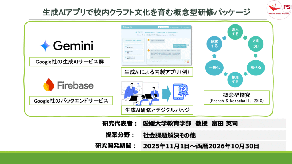 研究のステップ1では、連携先である松山市教育委員会と共同で授業用ウェブアプリを試作し、実際の学校教育で運用する計画です 。同時に、教育委員会がアプリを内製できるようになるための研修プログラムのプロトタイプ開発も進められます 。このパッケージは、Google社の生成AIサービス群「Gemini」やバックエンドサービス「Firebase」を活用し、教職員がAIを使いこなして校内に「クラフト文化」を育むための概念型研修パッケージとなることを目指しています。研修を受けた教職員には、デジタルバッジも発行される予定です。研究開発期間は2025年11月1日から2026年10月30日までです。