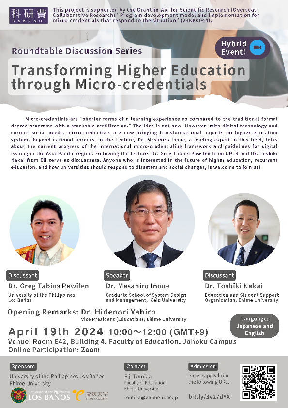 From April 15 to 19, 2024, the Faculty of Education at Ehime University hosted an international roundtable and lecture series focused on the development and implementation of micro-credentials. Organized by Professor Eiji Tomita, the event welcomed a delegation from the University of the Philippines Los Baños (UPLB), including Dr. Greg Tabios Pawilen, Dr. Rufo Gil Z. Albor, and Dr. Dick O. Eugenio, to engage in a five-day collaborative exchange.